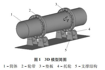 本文以某款谷物類烘干機(jī)為研究對(duì)象,烘干機(jī)一般包括干燥系統(tǒng)、上料系統(tǒng)、熱風(fēng)爐系統(tǒng)、出料系統(tǒng)、引風(fēng)系統(tǒng)、控制系統(tǒng)與安全系統(tǒng)。干燥系統(tǒng)是其最為關(guān)鍵的系統(tǒng),主要組成部件為筒體、輪帶、墊板、托輪和支撐結(jié)構(gòu),其中筒體、墊板和輪帶都為設(shè)備運(yùn)行過(guò)程中主要的受力部件,且易發(fā)生失效,而托輪和支撐結(jié)構(gòu)所受為體積力,均布于整個(gè)結(jié)構(gòu)系統(tǒng),一般不會(huì)發(fā)生應(yīng)力失效。